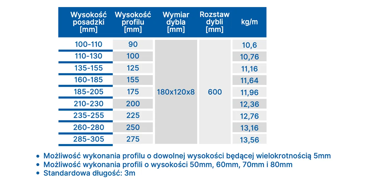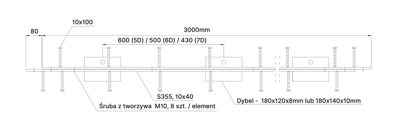 - Standardowy odstęp pomiędzy dyblami: 600mm (typ 5D)