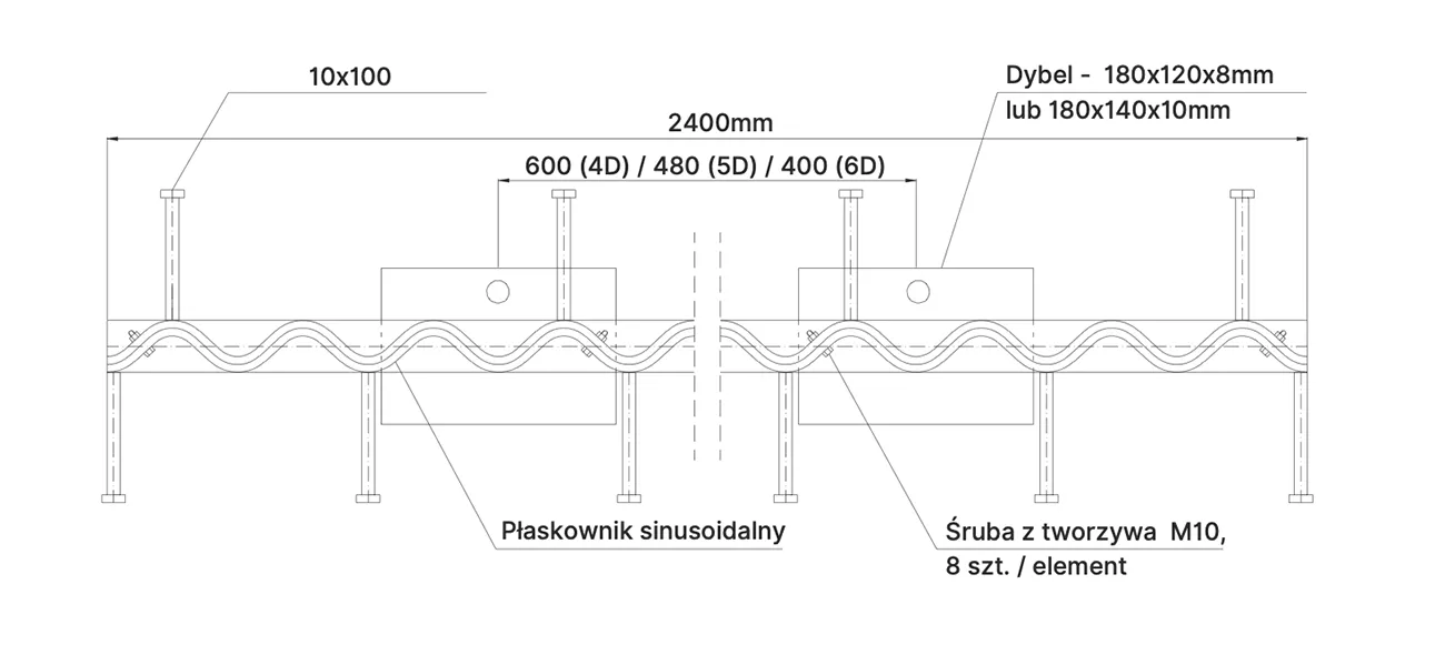 - Standardowy odstęp pomiędzy dyblami: 600 mm (typ 4D)