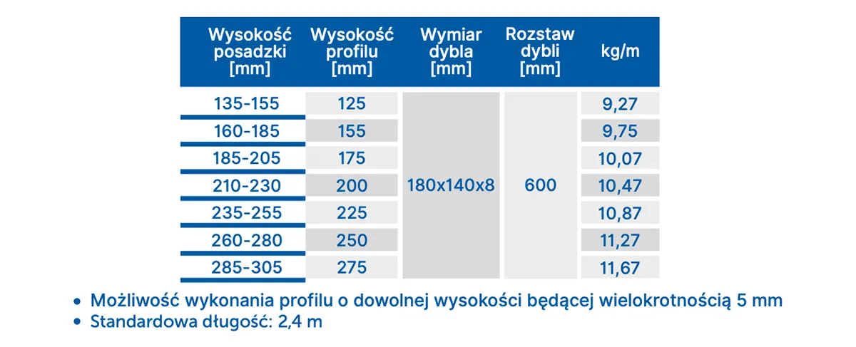 - Standardowy gatunek stali w górnej części profilu: S235, system dyblowania: S355